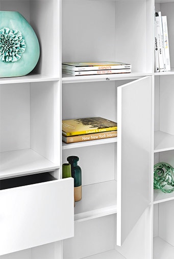Either as a completely open shelving element as shelves with doors and drawers or with a continuous door.