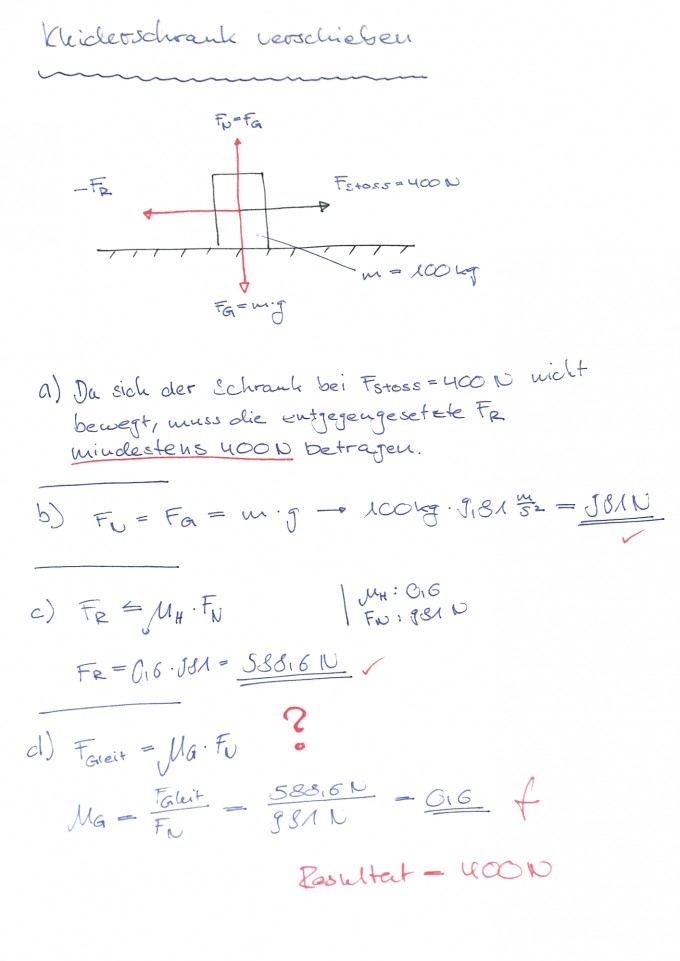 Physik Haftreibungszahl Gleitreibungskraft Holzschrank Auf